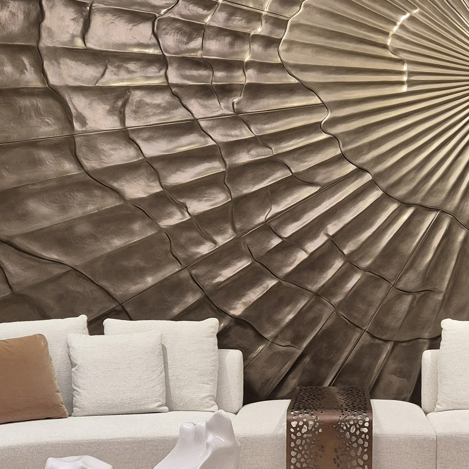 Our process transforms liquid metal into sculptural surfaces. Applied by hand, the metal flows and settles naturally before being carefully sanded and polished to reveal the material beneath.